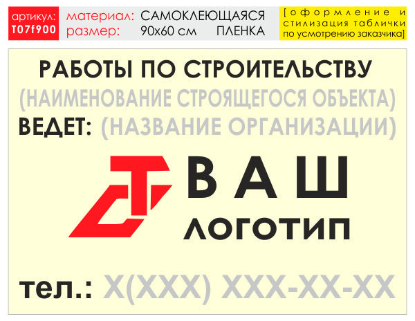 Баннер «Работы по строительству», T07 (самоклеящаяся плёнка, 90х60 см) в Черкесске купить