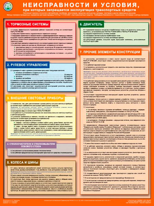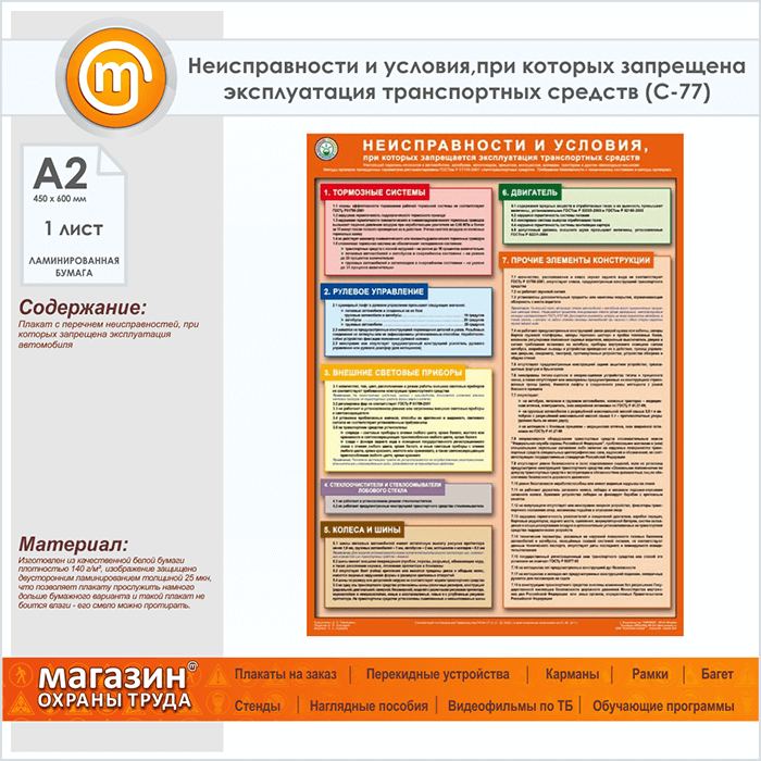 Плакат «Неисправности и условия, при которых запрещена эксплуатация транспортных средств» (С-77, ламинированная бумага, А2, 1 лист) в Черкесске купить