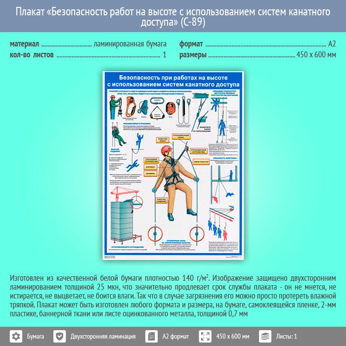 Плакат «Безопасность работ на высоте с использованием систем канатного доступа» (С-89, ламинированная бумага, А2, 1 лист) в Черкесске купить