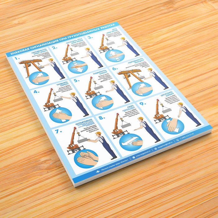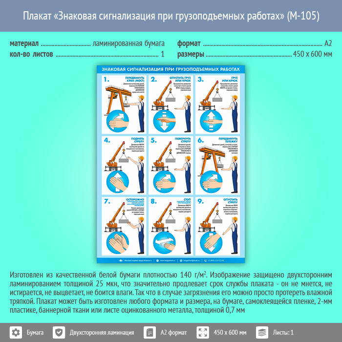Плакат «Знаковая сигнализация при грузоподъемных работах» (М-105, ламинированная бумага, А2, 1 лист) в Черкесске купить