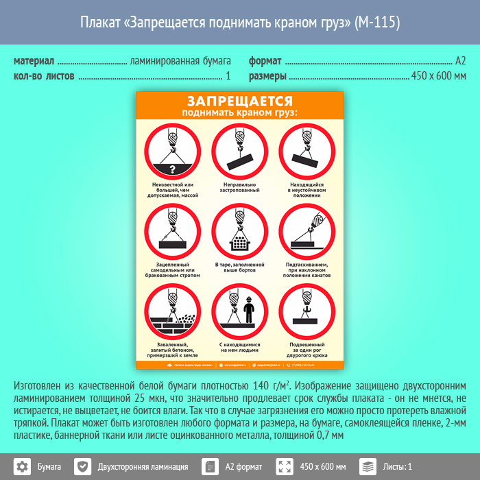 Плакат «Запрещается поднимать краном груз» (М-115, ламинированная бумага, А2, 1 лист) в Черкесске купить