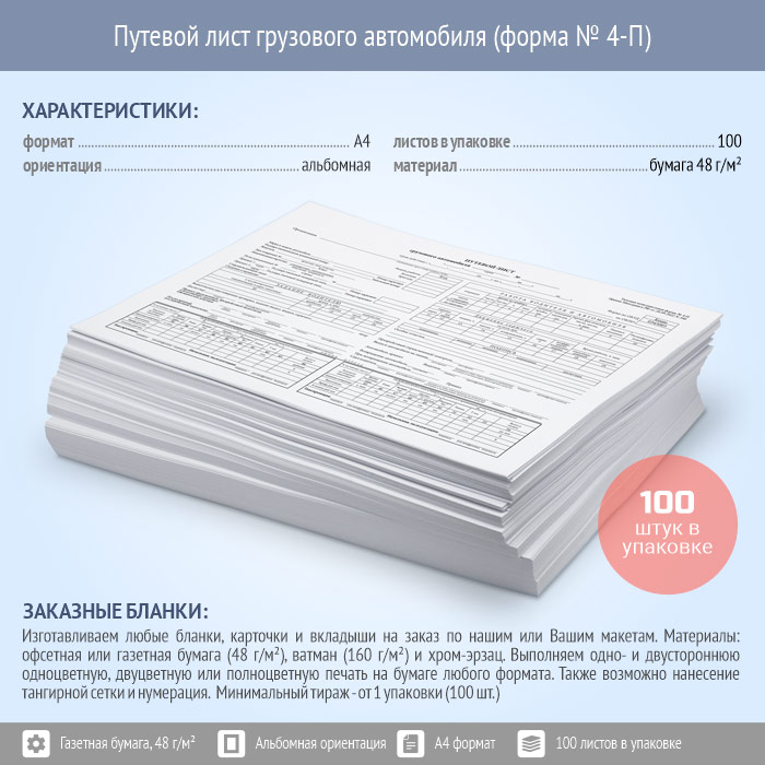 Путевой лист грузового автомобиля (форма № 4-П, упаковка из 100 штук) в Черкесске купить