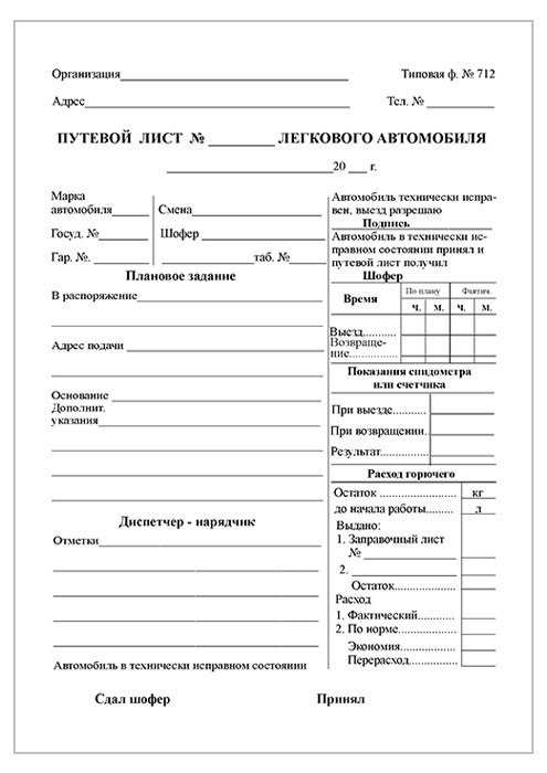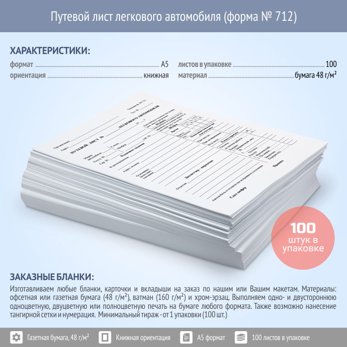 Путевой лист легкового автомобиля (форма № 712, упаковка из 100 штук) в Черкесске купить