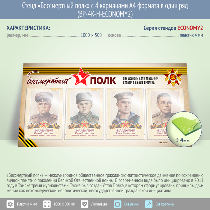 Стенд «Бессмертный полк» с 4 карманами А4 формата в один ряд (BP-4K-H-ECONOMY2) в Черкесске купить