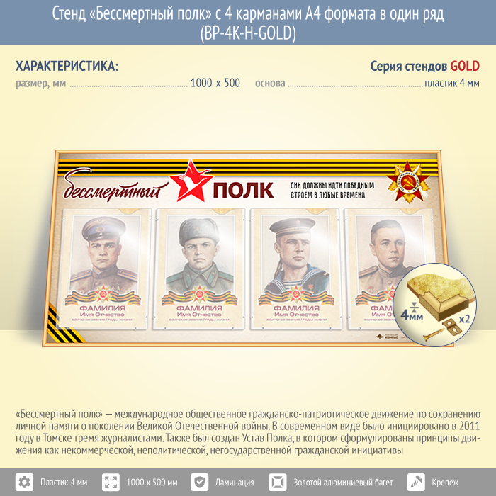 Стенд «Бессмертный полк» с 4 карманами А4 формата в один ряд (BP-4K-H-GOLD) в Черкесске купить