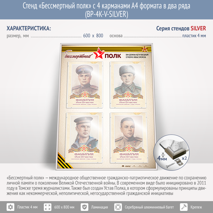 Стенд «Бессмертный полк» с 4 карманами А4 формата в два ряда (BP-4K-V-SILVER) в Черкесске купить
