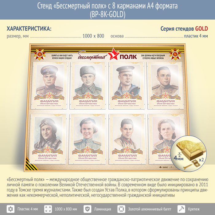 Стенд «Бессмертный полк» с 8 карманами А4 формата (BP-8K-GOLD) в Черкесске купить