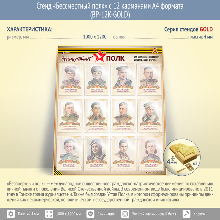 Стенд «Бессмертный полк» с 12 карманами А4 формата (BP-12K-GOLD) в Черкесске купить