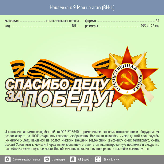 Наклейка к 9 Мая на авто А4 формата (BH-1) в Черкесске купить