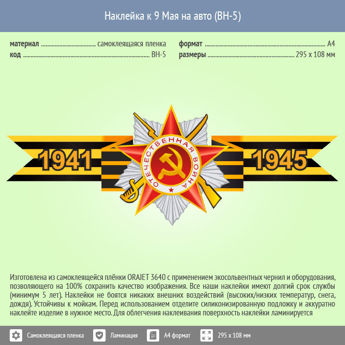 Наклейка к 9 Мая на авто А4 формата (BH-5) в Черкесске купить