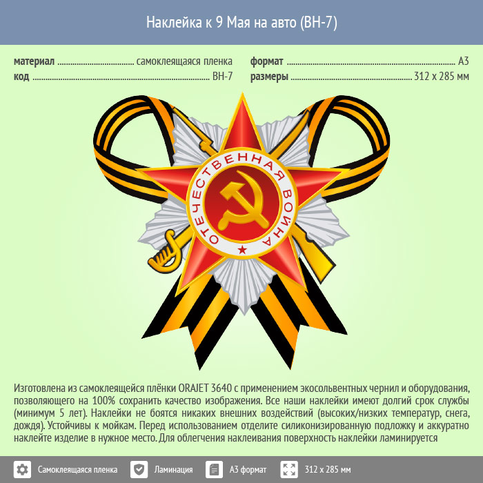 Наклейка к 9 Мая на авто А3 формата (BH-7) в Черкесске купить