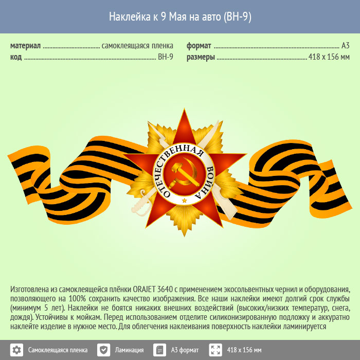 Наклейка к 9 Мая на авто А3 формата (BH-9) в Черкесске купить