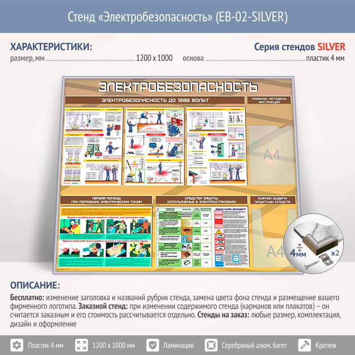 Стенд «Электробезопасность до 1000 вольт» с плоским и объемным карманами (EB-02-SILVER) в Черкесске купить