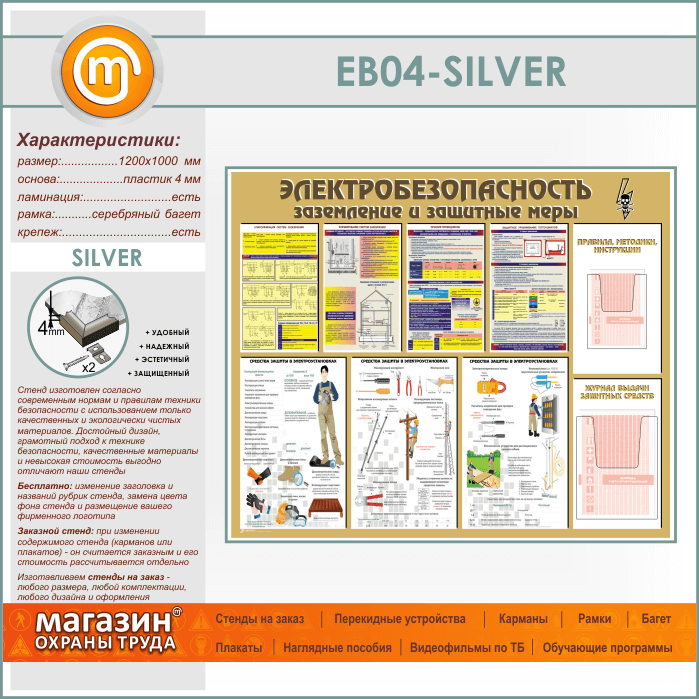 Стенд «Электробезопасность. Заземление и защитные меры» с 2 объемными карманами (EB-04-SILVER) в Черкесске купить