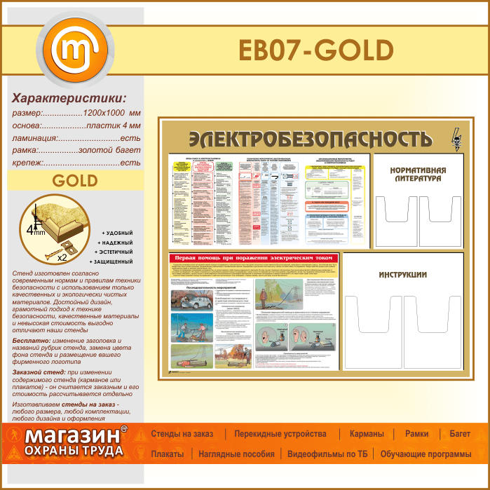 Стенд «Электробезопасность» с 4 объемными карманами (EB-07-GOLD) в Черкесске купить