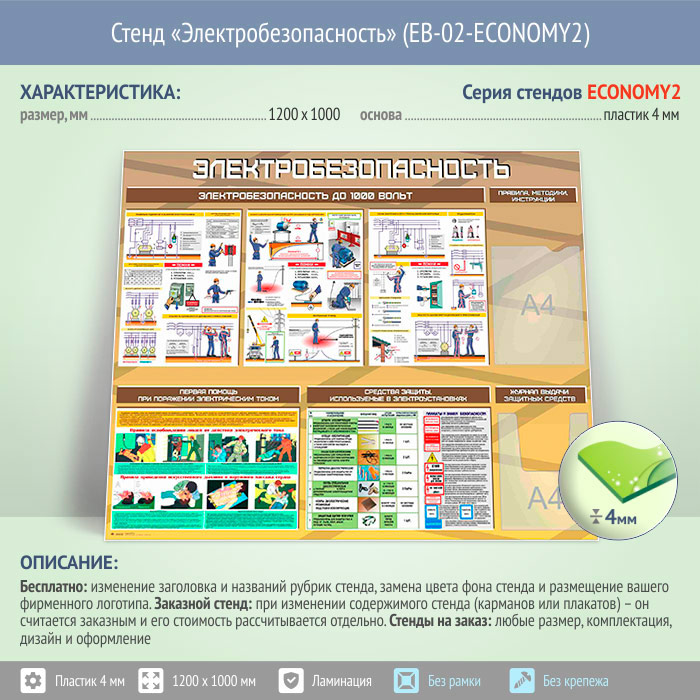 Стенд «Электробезопасность до 1000 вольт» с плоским и объемным карманами (EB-02-ECONOMY2) в Черкесске купить