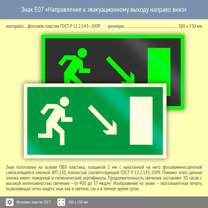 Знак E07 «Направление к эвакуационному выходу направо вниз» (фотолюминесцентный пластик ГОСТ 34428-2018, 300х150 мм) в Черкесске купить