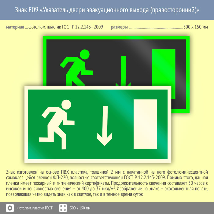 Знак E09 «Указатель двери эвакуационного выхода (правосторонний)» (фотолюминесцентный пластик ГОСТ 34428-2018, 300х150 мм) в Черкесске купить