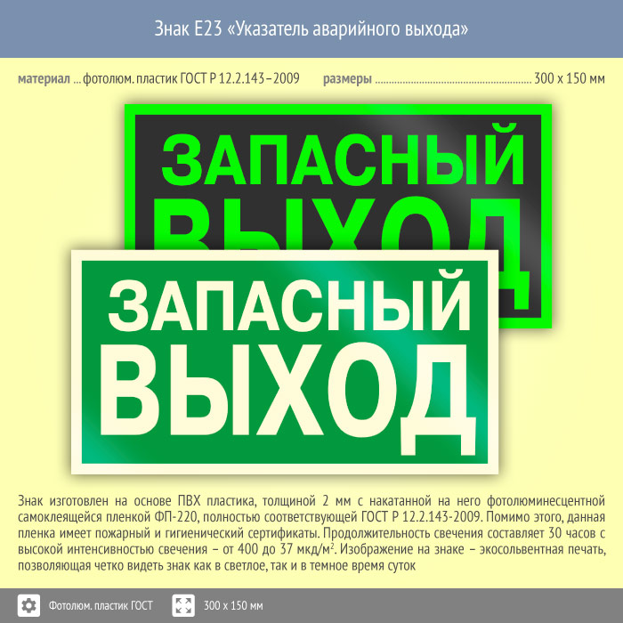Знак E23 «Указатель запасного выхода» (устаревший) (фотолюминесцентный пластик ГОСТ 34428-2018, 300х150 мм) в Черкесске купить