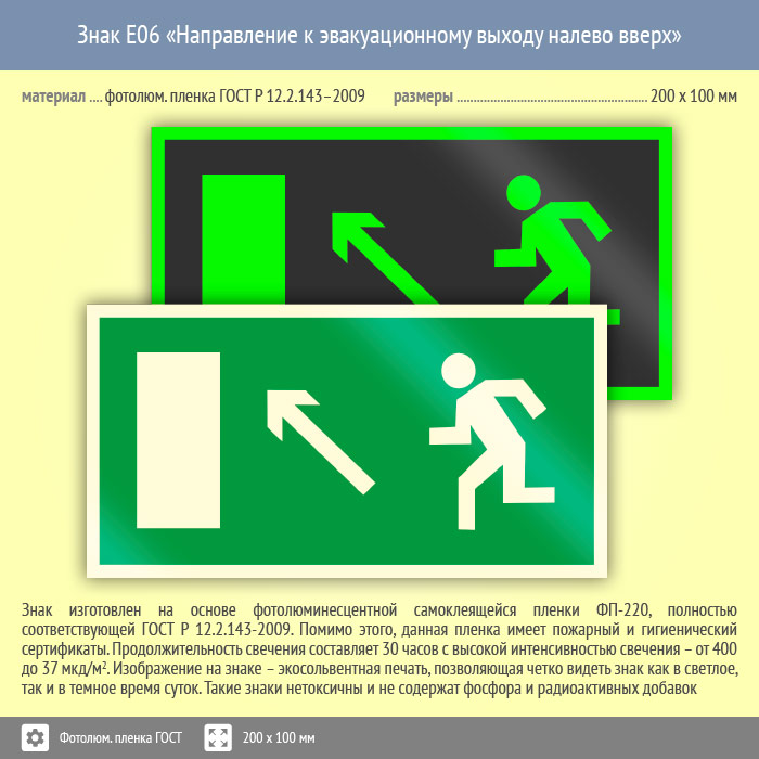 Знак E06 «Направление к эвакуационному выходу налево вверх» (фотолюминесцентная пленка ГОСТ 34428-2018, 200х100 мм) в Черкесске купить