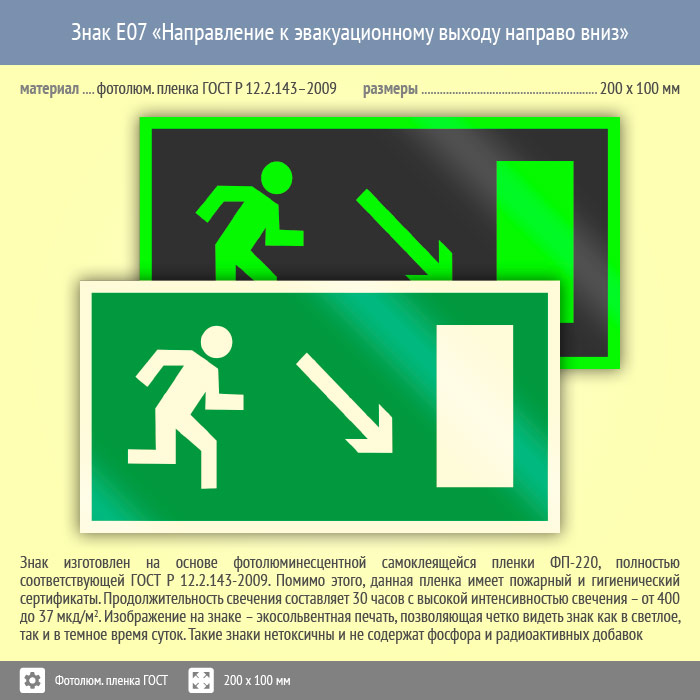 Знак E07 «Направление к эвакуационному выходу направо вниз» (фотолюминесцентная пленка ГОСТ 34428-2018, 200х100 мм) в Черкесске купить