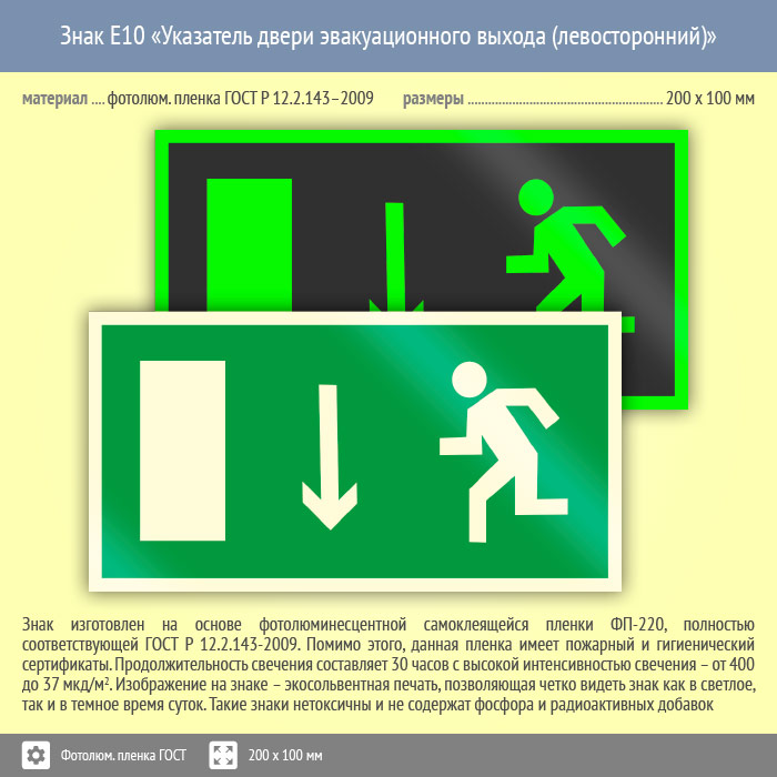 Знак E10 «Указатель двери эвакуационного выхода (левосторонний)» (фотолюминесцентная пленка ГОСТ 34428-2018, 200х100 мм) в Черкесске купить
