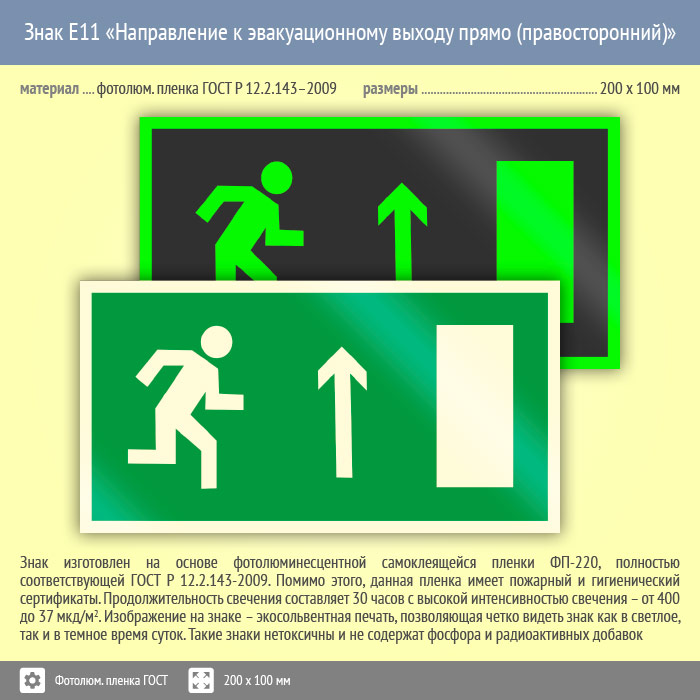 Знак E11 «Направление к эвакуационному выходу прямо (правосторонний)» (фотолюминесцентная пленка ГОСТ 34428-2018, 200х100 мм) в Черкесске купить