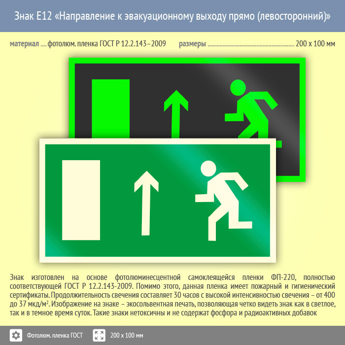 Знак E12 «Направление к эвакуационному выходу прямо (левосторонний)» (фотолюминесцентная пленка ГОСТ 34428-2018, 200х100 мм) в Черкесске купить