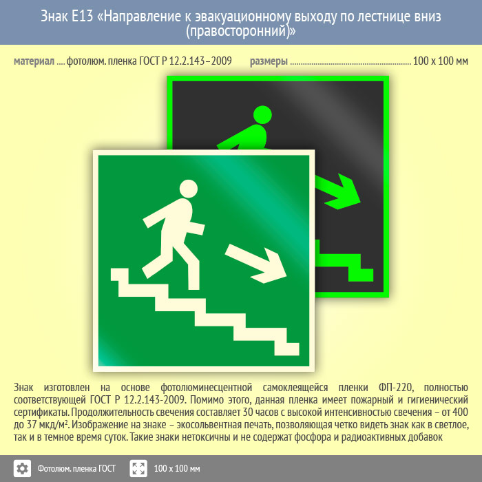 Знак E13 «Направление к эвакуационному выходу по лестнице вниз (правосторонний)» (фотолюминесцентная пленка ГОСТ 34428-2018, 100х100 мм) в Черкесске купить