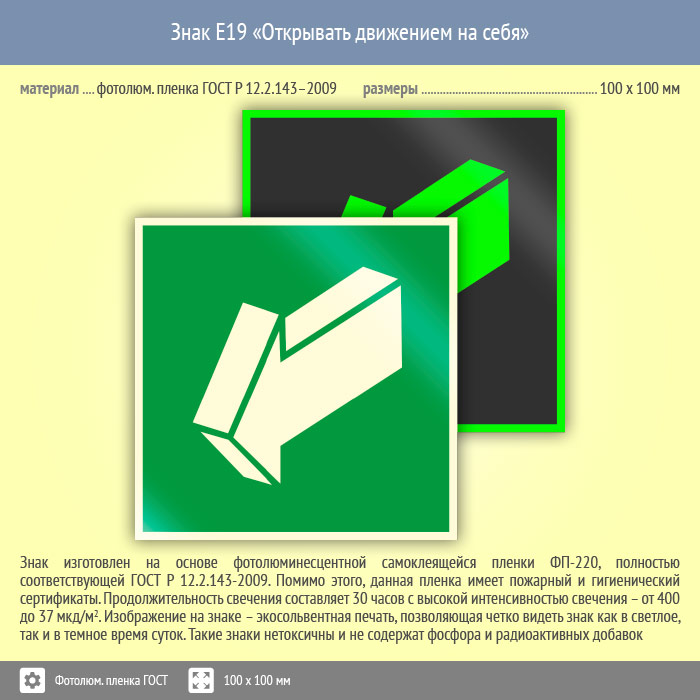 Знак E19 «Открывать движением на себя» (фотолюминесцентная пленка ГОСТ 34428-2018, 100х100 мм) в Черкесске купить