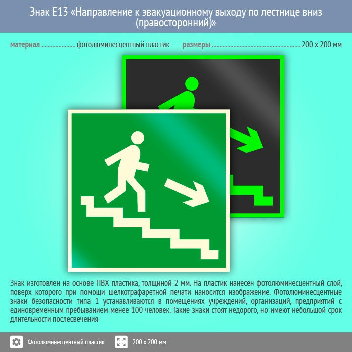 Знак E13 «Направление к эвакуационному выходу по лестнице вниз (правосторонний)» (фотолюминесцентный пластик, 200х200 мм) в Черкесске купить