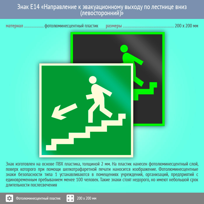Знак E14 «Направление к эвакуационному выходу по лестнице вниз (левосторонний)» (фотолюминесцентный пластик, 200х200 мм) в Черкесске купить