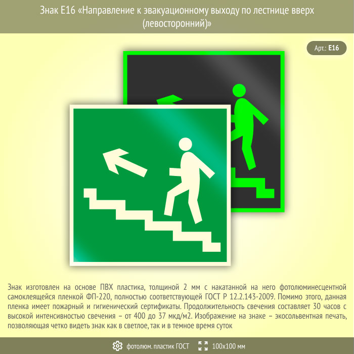 Знак E16 «Направление к эвакуационному выходу по лестнице вверх (левосторонний)» (фотолюминесцентный пластик ГОСТ 34428-2018, 100х100 мм) в Черкесске купить