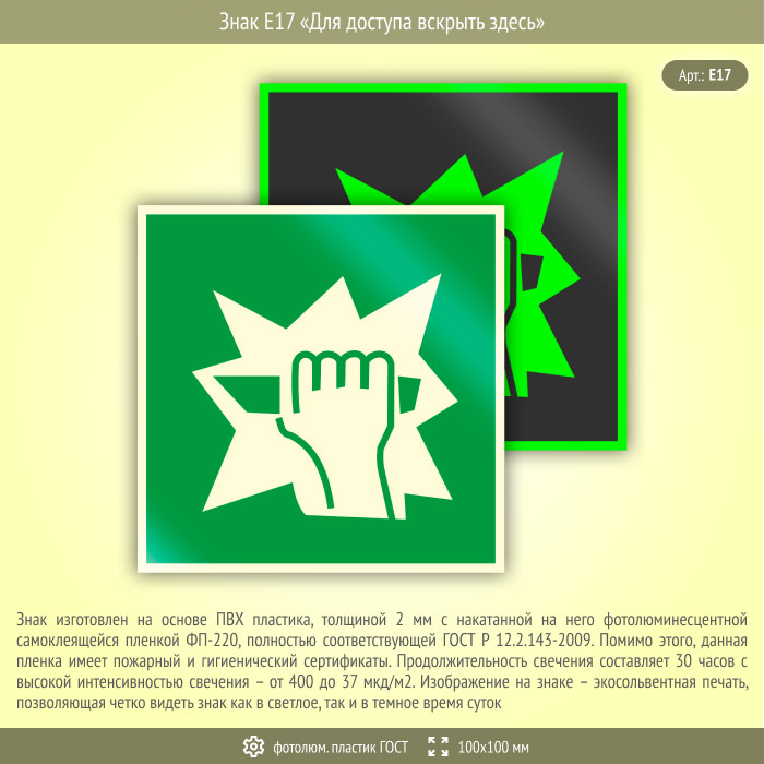 Знак E17 «Для доступа вскрыть здесь» (фотолюминесцентный пластик ГОСТ 34428-2018, 100х100 мм) в Черкесске купить