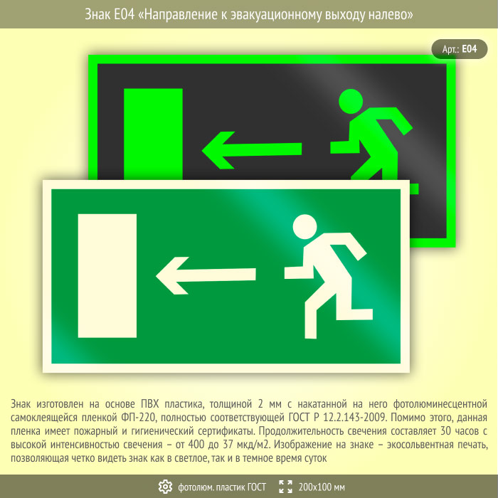 Знак E04 «Направление к эвакуационному выходу налево» (фотолюминесцентный пластик ГОСТ 34428-2018, 200х100 мм) в Черкесске купить
