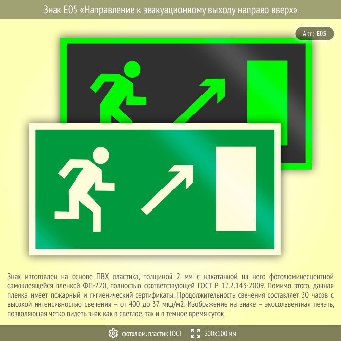 Знак E05 «Направление к эвакуационному выходу направо вверх» (фотолюминесцентный пластик ГОСТ 34428-2018, 200х100 мм) в Черкесске купить