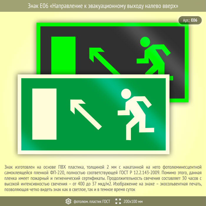 Знак E06 «Направление к эвакуационному выходу налево вверх» (фотолюминесцентный пластик ГОСТ 34428-2018, 200х100 мм) в Черкесске купить