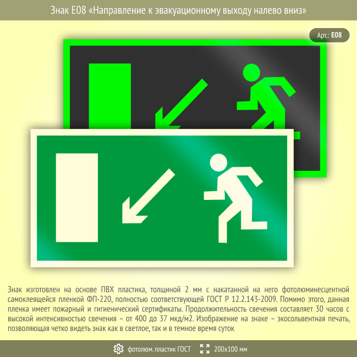 Знак E08 «Направление к эвакуационному выходу налево вниз» (фотолюминесцентный пластик ГОСТ 34428-2018, 200х100 мм) в Черкесске купить