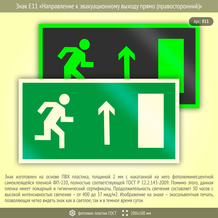 Знак E11 «Направление к эвакуационному выходу прямо (правосторонний)» (фотолюминесцентный пластик ГОСТ 34428-2018, 200х100 мм) в Черкесске купить