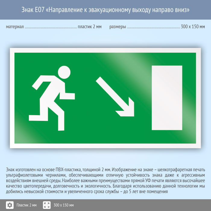 Знак E07 «Направление к эвакуационному выходу направо вниз» (пластик, 300х150 мм) в Черкесске купить