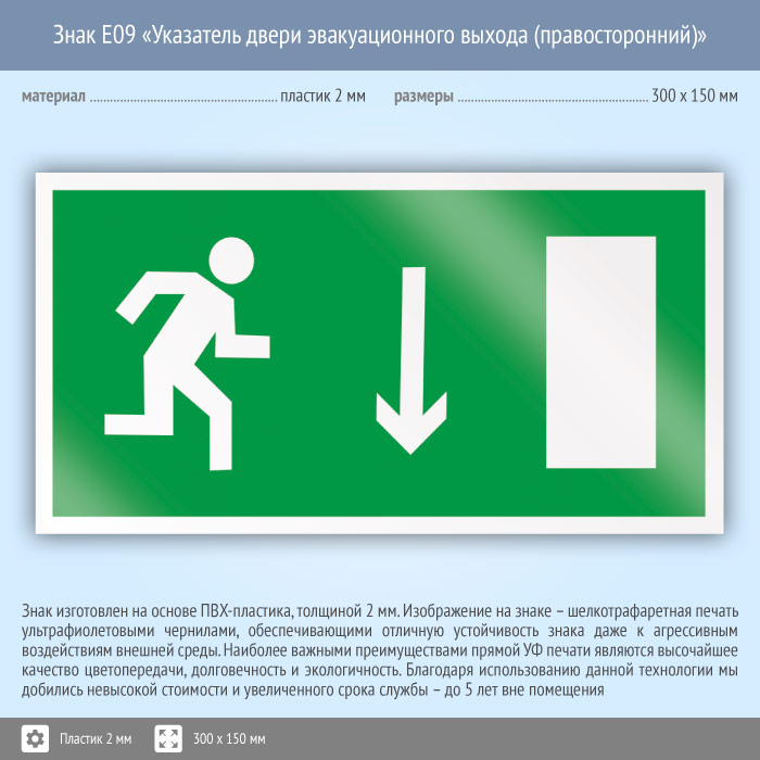 Знак E09 «Указатель двери эвакуационного выхода (правосторонний)» (пластик, 300х150 мм) в Черкесске купить