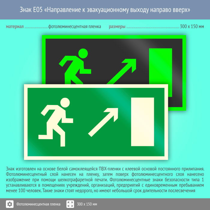 Знак E05 «Направление к эвакуационному выходу направо вверх» (фотолюминесцентная пленка, 300х150 мм) в Черкесске купить