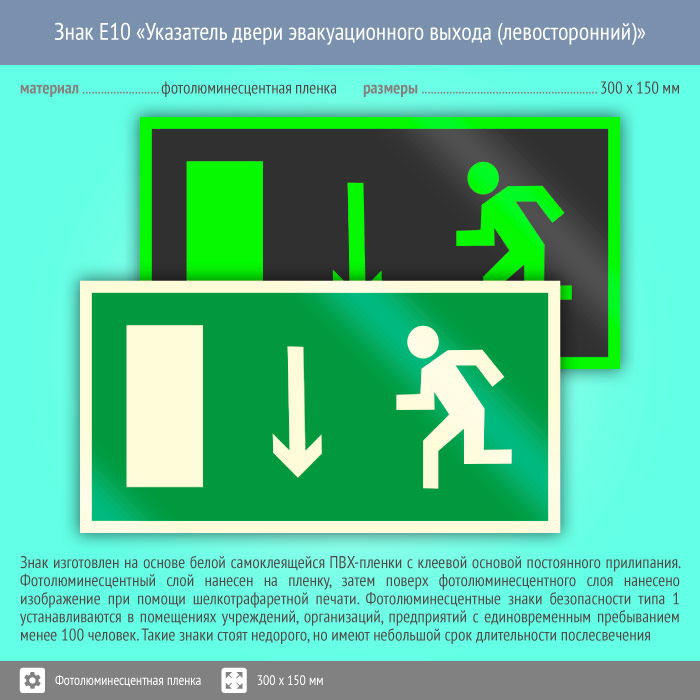 Знак E10 «Указатель двери эвакуационного выхода (левосторонний)» (фотолюминесцентная пленка, 300х150 мм) в Черкесске купить