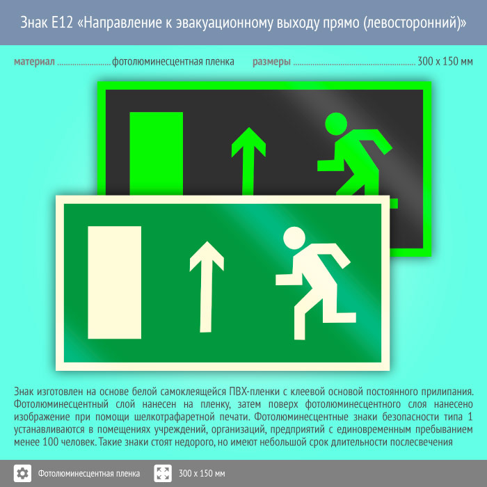 Знак E12 «Направление к эвакуационному выходу прямо (левосторонний)» (фотолюминесцентная пленка, 300х150 мм) в Черкесске купить