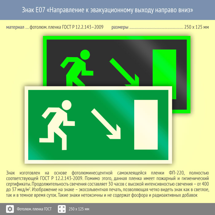 Знак E07 «Направление к эвакуационному выходу направо вниз» (фотолюминесцентная пленка ГОСТ 34428-2018, 250х125 мм) в Черкесске купить