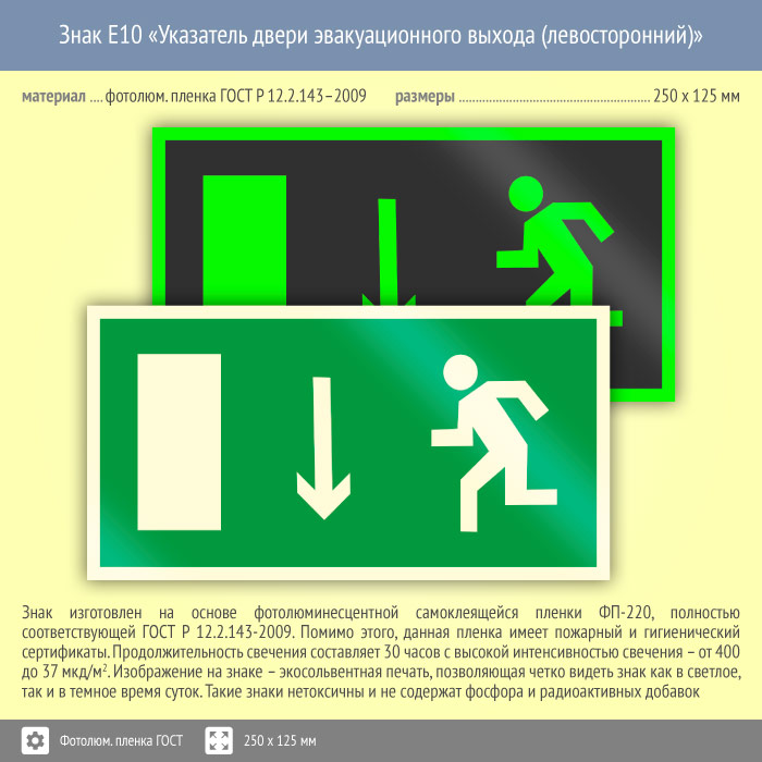 Знак E10 «Указатель двери эвакуационного выхода (левосторонний)» (фотолюминесцентная пленка ГОСТ 34428-2018, 250х125 мм) в Черкесске купить