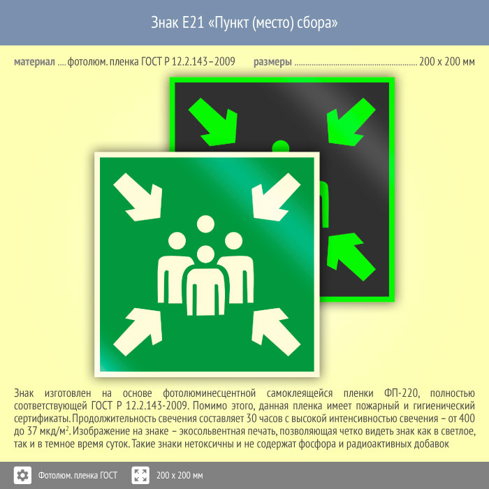 Знак E21 «Пункт (место) сбора» (фотолюминесцентная пленка ГОСТ 34428-2018, 200х200 мм) в Черкесске купить