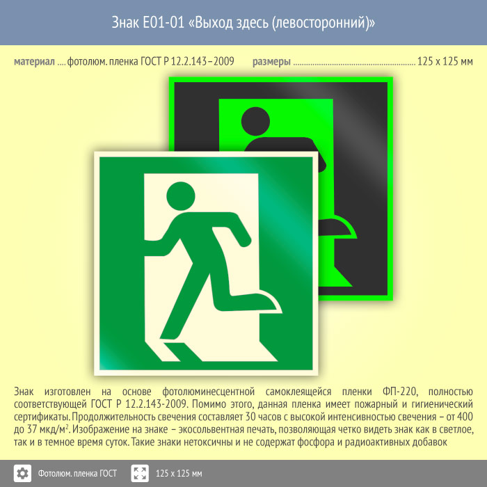 Знак E01-01 «Выход здесь (левосторонний)» (фотолюминесцентная пленка ГОСТ 34428-2018, 125х125 мм) в Черкесске купить