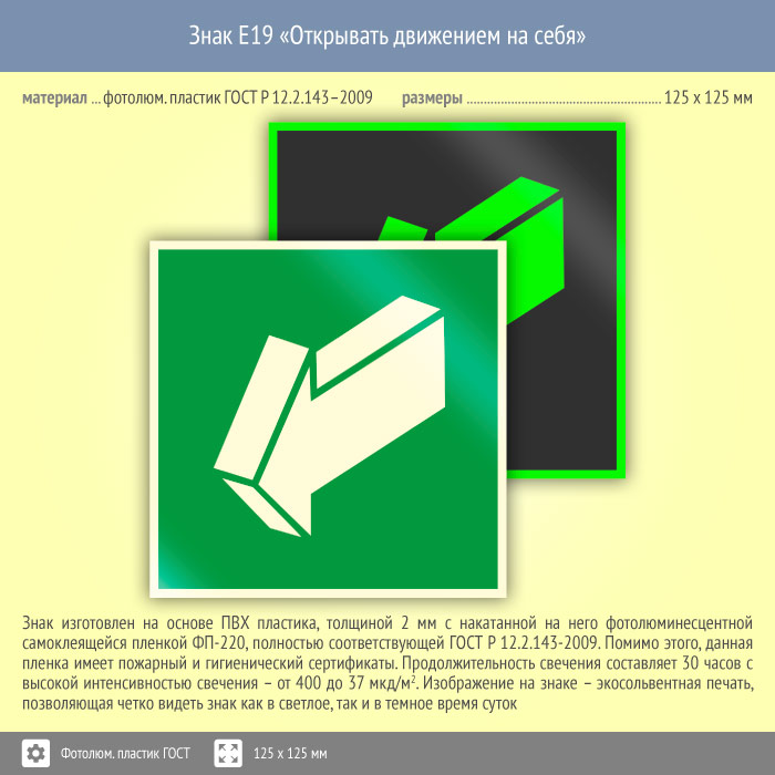 Знак E19 «Открывать движением на себя» (фотолюминесцентный пластик ГОСТ 34428-2018, 125х125 мм) в Черкесске купить