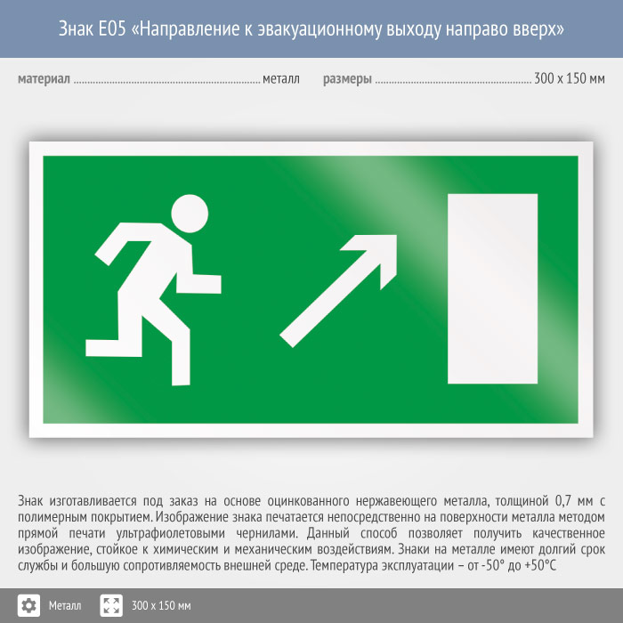 Знак E05 «Направление к эвакуационному выходу направо вверх» (металл, 300х150 мм) в Черкесске купить